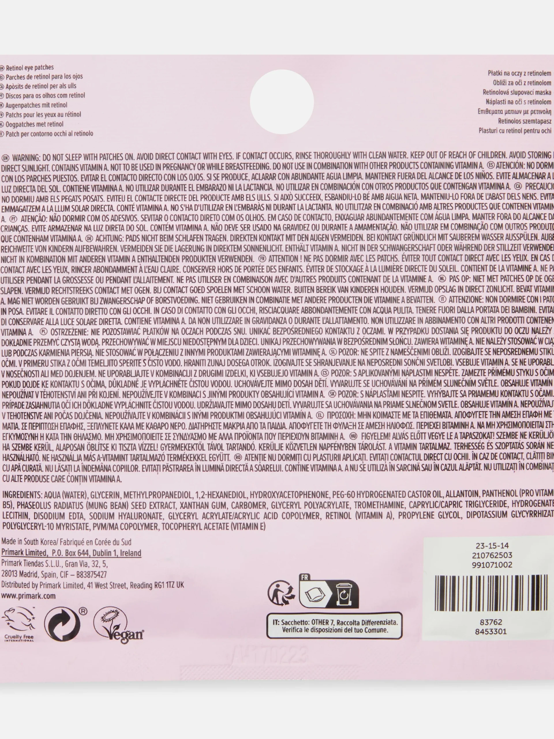 Primark Máscaras Faciais^PS… Disco Olhos Pele Retinol